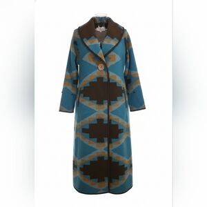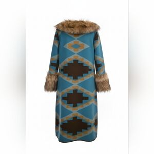Chic teal and brown long jacket with striking faux fur trim. Perfect for a stylish winter look. Faux fur cuffs and collar removable. Snap front closure, side pockets.