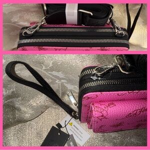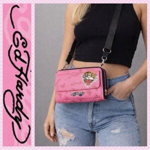 All of the above!!! 💖😍💝 This cutie is an Ed Hardy pink wallet crossbody with a vibrant, all-over tattoo-inspired graphic print. The design features the brand's name, a tiger face, butterflies, and hearts, consistent with the brand's iconic Y2K aesthetic. The epitome of cool, Ed Hardy is offering this baddie in a Barbie or bubblegum pink