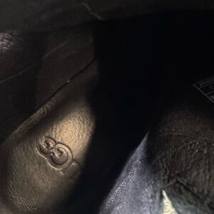 In good clean condition with some minor wear at wood block heel. Beautiful premium leather uppers in a charcoal color. Intricate tone on tone stitching.