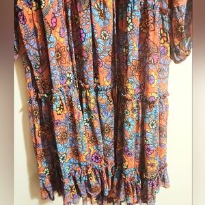 Anthropologie bohemian pattern maxidress. Rust colored base with light blue/cream/purple/yellow floral pattern. Long sleeved with lace separator detailing throught. High/low, flowy, tiered ruffled skirt. V-neck with partial button down and tie front closure. Lined.