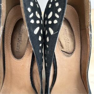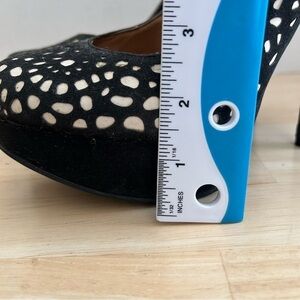 Roberto Vianni 'Azure' Platform Heels Fabric overlay design Heel: 5.25" Platform: 1.25"   Material: Leather and textile upper Man Made sole   Colour: Black and white Size: 7.5" Great pre-owned condition. Wear on fabric-shown in last photos. Normal overall wear.  Taking Reasonable Offers 📦 Fast Shipping ⚠️ Use Measurements to be sure of fit when possible! Just a reminder that your review is about the product you received and the sellers service. It does not include Canada Posts delivery time – I ship same day or next day depending on the time of sale. Thank you! Happy Shopping!