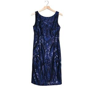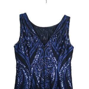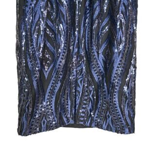 Dazzle in this stunning sequin dress. Fully lined w/black slip, zips in back with hook. Beautiful Dark Blue Designs & Sequins! Gorgeous Dress