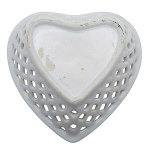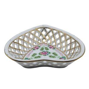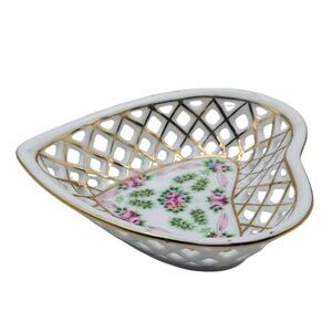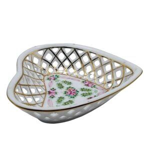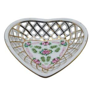 Vintage Reticulated Open Lace Hand Painted Porcelain Heart-Shaped Trinket Dish