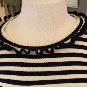 P2P 18.5”. Length 25” Adorable and preppy! Great for a crisp spring summer look. Elevate your wardrobe with this chic black and white striped top. Featuring elegant ruffle trim, it's perfect for any occasion.