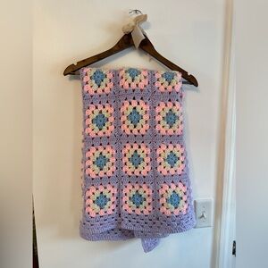 Beautiful handmade crochet blanket featuring pastel squares. Soft and cozy design with pink, purple, and green colors. Awesome baby gift. About 40x40in
