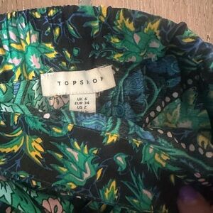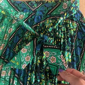 Stylish asymmetrical skirt with floral and geometric patterns. Features vibrant green and blue hues. Perfect for a chic, modern look.