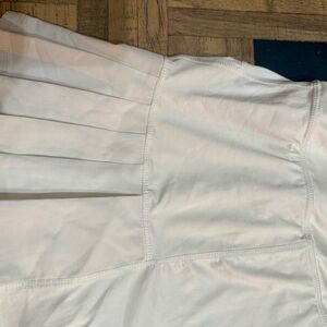 This versatile skort features a crisp white color with unique pleated side detail and an integrated inner short for maximum coverage and comfort during movement. A convenient rear zipper pocket on the waistband provides secure storage for small essentials like keys or cards. Flared hem for a playful look.