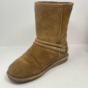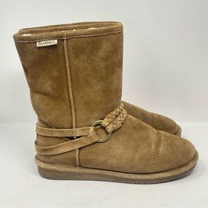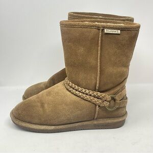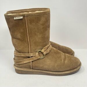 BearPaw Adele Boots Womens 9 Brown Tan Suede Fur Lined Mid Calf Braided Strap