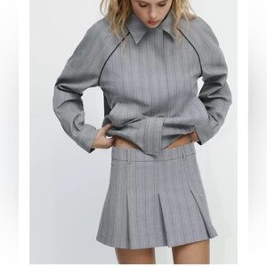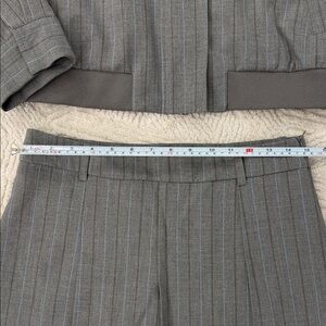 Excellent condition. Worn once. Stylish gray pinstripe jacket and skirt set. Perfect for a chic look.