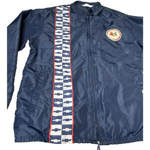 This Vintage 60s 70s Horizon Sportswear Chevrolet Corvette Racing Windbreaker is a lightweight men's jacket in size L, with a chest size of 44 inches and a sleeve length of 23.5 inches. The windbreaker features a retro design from the 1970s, with a blue color and nylon material. Made in the United States by Chevrolet, this original windbreaker exudes a classic look with a shoulder to shoulder measurement of 18 inches and a shoulder to hem length of 26 inches. Perfect for casual occasions, this vintage piece is a stylish and nostalgic addition to any wardrobe. Gently worn and in good overall condition. There are a couple white marks on the left sleeve and a couple small pulls, pictured. No holes or stains. Smoke-free, pet-free home.