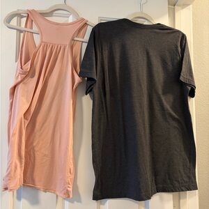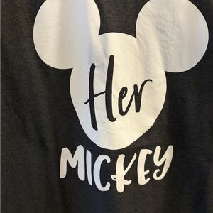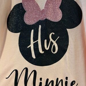Cute couple shirts featuring 'His Minnie' in light pink with glitter Minnie head size medium and 'Her Mickey' in dark grey size large. The Minnie tank has some piling (see picture) but not noticed on. Sold together and perfect for matching outfits! Bought from a small business for a Disneyworld trip!