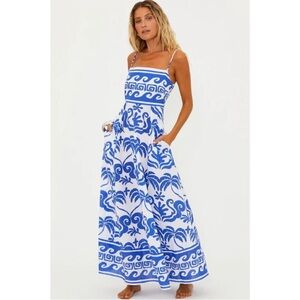 Embrace the charm of endless summer days with the Beach Riot Rianne Dress in a captivating blue and white Shore Palms print. This women's maxi dress showcases delicate spaghetti straps, a square neckline, and a flattering A-line silhouette, complete with practical side pockets.