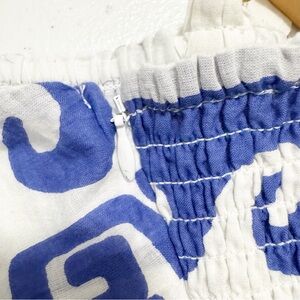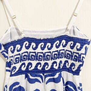 This maxi dress features a square neck, A-line silhouette, side pockets, and a stunning blue and white Shore Palms print. This dress has smocking detail on the back and adjustable straps with gold hardware. A maxi dress that is just as cute as it is comtortable.