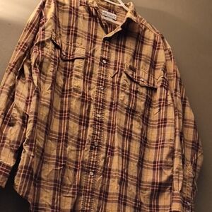 Carhartt - Plaid Snap Button Down Shirt Tan / Mustard with Brown / Burgundy Men's Large - 26" Inch Pit To Pit Used - Very Good Condition No Obvious Wear Casual button-down with a bold plaid pattern. Features dual chest pockets. Ideal for everyday wear. Authentic & Genuine