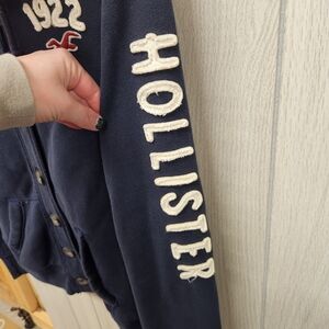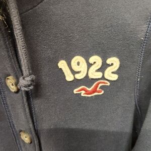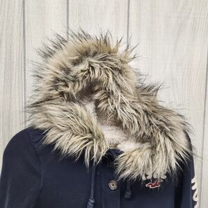 This item is a vintage Hollister Co. women's navy blue hoodie with a faux-fur trim on the hood, a button-up front, and an embroidered logo with the year "1922". It is a classic Y2K or 2000s era piece often described as having a preppy or grunge style.