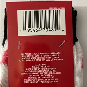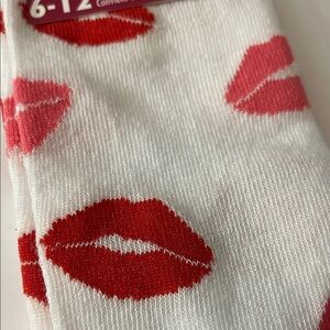 Fun crew socks with red lip design. Black accents on a white base. Perfect for casual wear. Valentine’s Day idea.