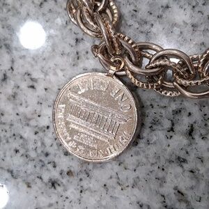Elegant silver charm bracelet featuring a bell, airplane, heart, and more. Perfect for adding a touch of charm to any outfit.