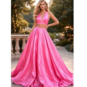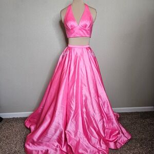 Keywords: pink dress, satin two piece, halter crop top, ballgown skirt, beaded pockets, prom dress, formal gown, evening wear, pageant dress, party dress, glamorous, elegant, statement piece, Barbie, Girly, Quinceanera