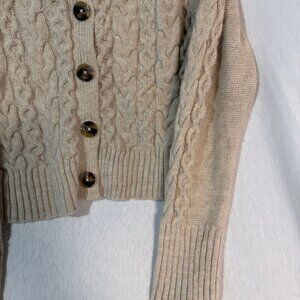 Beautiful Maeve by Anthropologie cable knit sweater in a soft neutral tone. Features a classic textured knit with button-front detail for a cozy yet polished look. Ideal for fall and winter layering.