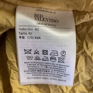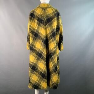 RED VALENTINO coat is a vibrant and stylish addition to a high-end outerwear collection. Expertly crafted in Romania from a warm wool blend, it features a bold yellow and black plaid pattern that commands attention. Designed for an adult female in a size Medium, the coat is distinguished by its elegant 3/4 sleeves, offering a modern silhouette.