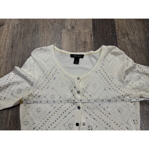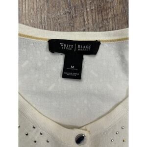 This is a stylish cardigan from White House Black Market featuring intricate embellishments. The sweater is perfect for adding a touch of elegance to any outfit. It is made of a 72% rayon/28% nylon blend and is in excellent used condition. It is a size medium.