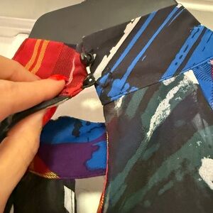 Vibrant blouse with striking red and blue patterns. Perfect for a bold look. Last pic references buttons that are loose