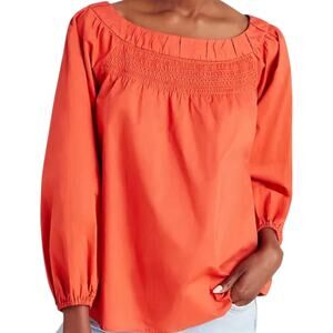 Anthropologie Maeve Jessie Smocked Swing Blouse Puff Sleeve 100% Cotton Coral S