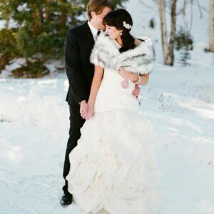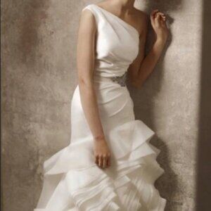 Beautiful White/light ivory (this is not stark white) by Vera Wang One Shoulder gown in Ivory with Organza fishtail waterfall style skirt and train. This is a bridal size 10, but I was roughly a US 6-8 in normal dress sizes when I wore it. This dress was purchased at David's Bridal and has since been professionally cleaned. I will need to fold it to ship but will ship in a garment bag and package as carefully as possible! Belts pictured were not part of the dress- selling the dress only. There is one small stain on the hip, slightly smaller than a pencil eraser and pictured in photos. May still come out, but I admittedly haven't tried! Train does have bustle buttons and loops and there is boning in the sides for support as well as a concealing inner waist belt. Please note that the organza ruffles throughout the skirt are raw hems- and were sold that way/intended to be raw. Due to wear on wedding night, some edges may have frayed a little, but the dress looks wonderful and that detail would not be discernible to anyone while wearing!