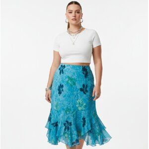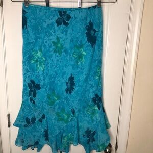 Vibrant Teal blue skirt with green floral patterns. Features a flared Ruffle hem.