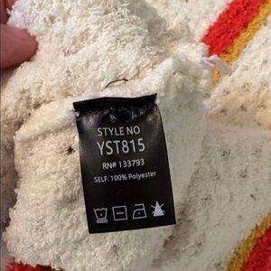 Cozy crew neck sweater with vibrant stripes. Features red, blue, yellow, and green accents. Perfect for casual wear.