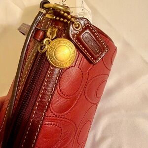 Chic red leather wristlet with embossed design. Features a sleek strap and gold-tone accents. Ideal for stylish outings.