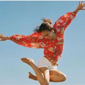 Elevate your wardrobe with this stunning women's blouse from Maeve Anthropologie. The top features a beautiful floral pattern, long balloon sleeves, and a flattering ballet neckline. A button closure adds a touch of sophistication, making it perfect for any occasion, whether it's a weekend getaway, a work meeting, or a night out with friends.