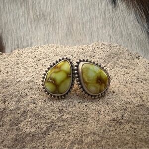 For your consideration are these Palomino variscite stud earrings that feature a beautiful, rich gemstone known for its distinctive soft mint-green and golden-yellow hues with natural tan to brown matrix patterns. The two teardrop-shaped stones are set in solid sterling silver that is set in a brushed matte finish, often found in high end jewelry such as these earrings. The setting is further accented by a simple bezel with small, decorative silver beads, sometimes called a "dot" border, that encircle the bezel setting of each stone. This combination creates a simple yet striking Southwestern-style piece, stamped "Sterling" to confirm the quality of the metal used.