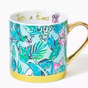 Lilly Pulitzer Vibrant mug with tropical design. Features playful animals and lush leaves. Gold handle and rim add elegance.