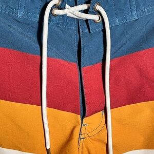 Dive into style with men's swim shorts. Featuring a vibrant multicolor design with teal, red, orange, and white stripes, these shorts are perfect for making a splash.