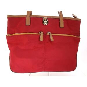 Keywords: Michael Kors tote, Nylon bag, Red handbag, Tan leather, MK logo, Designer bag, Everyday bag, Travel tote, Work tote, Fashion accessory, Shoulder bag, Zipper pockets