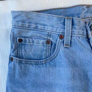 Embrace effortless style with these Levi's 501 jeans, celebrating their 150th anniversary with a unique blend of classic design and contemporary flair. In a light wash denim, these jeans offer a relaxed, straight-leg fit that flatters any figure. Distressed detailing at the knee, featuring a playful floral-patterned patch, adds an edgy yet feminine touch. The iconic Levi's red tab on the back pocket and the branded leather patch at the waistband provide timeless appeal. These jeans are your go-to choice for weekend adventures, casual outings with friends, or adding a touch of vintage charm to your everyday wardrobe.
