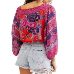 Free People Blue Nile, Free People floral top, peasant blouse, boho peasant top, romantic bohemian, folk style blouse, vintage inspired floral, purple floral top, orange floral blouse, magenta print top, colorful boho, balloon sleeve blouse, billowy sleeve top, bubble hem top, waist tie blouse, adjustable waist top, flowy silhouette, feminine boho, festival style, Coachella outfit, indie bohemian, gypsy style, prairie inspired, cottagecore boho, art teacher style, casual statement top, spring summer fall top, layering piece, size medium Free People