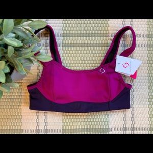 Brooks Fiona sports bra, part of the moving comfort collection. Wire-free, mid impact support; adjustable straps and back; beautiful "currant" color is a raspberry pink/purple combo. Excellent addition to your workout/athletic clothing wardrobe! Size 30B. New with tags; tiny snag on one side (see pic); inner tag is marked to prevent store return. From a smoke free home.