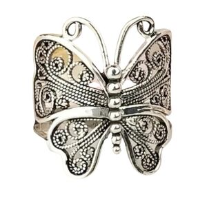 This elegant silvertone butterfly ring adds a touch of sophistication to any outfit. Perfect for any occasion.