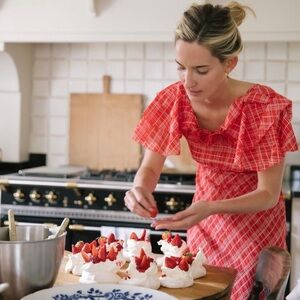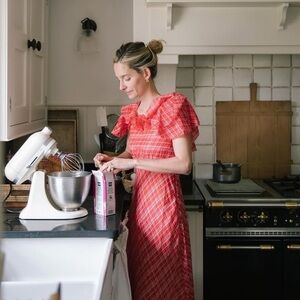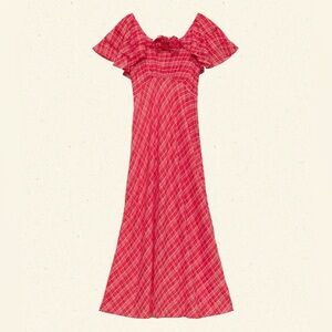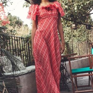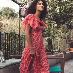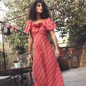 NWT Doen Nevara Cotton Rosette Short Sleeve Midi Maxi Dress Sylvie Plaid Red