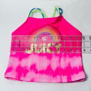 This product is a girls' top one-piece swimsuit from Juicy Couture. It features a tie-dye pattern in pink and purple, with a tank top style swim top and a bikini bottom. The suit is made from a shell of 82% polyester and 18% spandex, with a lining of 100% polyester. It is machine washable and comes in size 8. The swimsuit has a rainbow theme and is not vintage. It is a regular size type and is designed for girls. The product is made in China.
