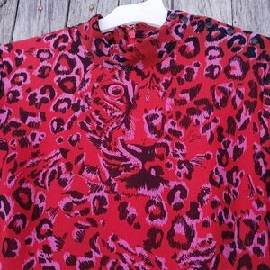 It's a beautiful red color of midi length dress with a high neckline and a jungle, animal print cat theme. It has long sleeves and a zip back closure. There are also snaps along the one shoulder. Is in excellent condition, Size 4