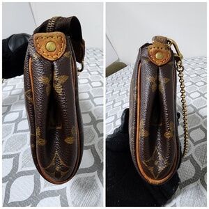 This authentic LOUIS VUITTON Monogram Canvas Eva Clutch/Crossbody Bag Brown is in its good pre-owned condition. The exterior coated canvas is clean. The vachatte leather that runs across the side of the bag shows sign of rubbing and honey wear patina to the leather so as the leather that holds the strap ring. The interior is clean but shows a little red ink stain to it. Gold hardware shows sign of rubbing to it. No leather long strap, it only comes with a chain strap. Kindly look at pictures above for all details.