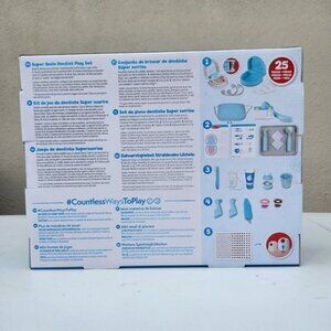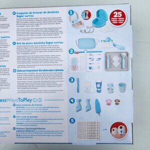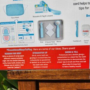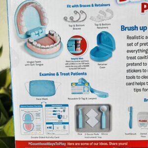 Includes set of pretend teeth, dry-erase marker, examination tools, toothbrush, toothpaste tube, dental rinse bottle and cup, 2 gauze pads, 3 tooth polish cups, top and bottom retainers and braces, mask, reusable ID tag on a lanyard, double-sided reusable activity card