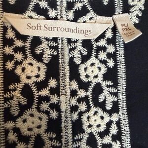 Size petite L/petite XL Soft Surroundings black rayon kimono jacket with all-over ivory cotton embroidered floral detail.