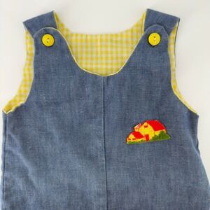 Charming vintage romper for baby, perfect for spring or summer days. This adorable piece features a light blue chambray fabric with a sweet embroidered barn scene on the front. It is lined with a yellow and white gingham pattern on top, adding a touch of country charm. The romper has yellow buttons at the shoulders and snaps at the bottom for easy changes. This unique romper is perfect for playdates, family outings, or a special photo shoot.