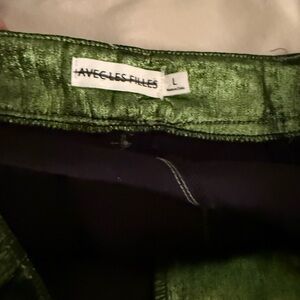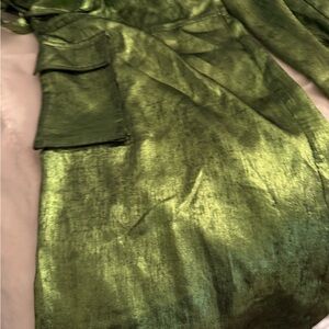 Elegant wide leg pants with a shimmering olive finish. Features cargo pockets for added style. Waist 32” length 42” hip 40” Oleg with 28” new never worn smoke pet free fast ship
