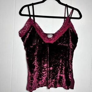 Keywords: velvet camisole, lace trim, spaghetti strap, burgundy, evening wear, party top, sexy, beaded, crushed velvet, date night, going out, festive, glam, y2k inspired