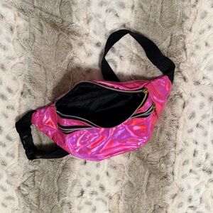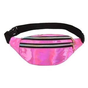 Stylish 80’s Retro Style iridescent hot pink fanny pack. Perfect for essentials. Pockets are big enough for a large phone with a lot of room. Great for casual outings. Can go around the waist or shoulder. Size is 12 inches.